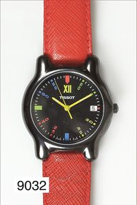 Damenarmbanduhr, TISSOT um 1995, "CERAMIKGEHÄUSE", schwarzes Zifferblatt, farbige arab. u. röm. Index, Datum auf 3 Uhr, Quarzwerk, Lederband mit Dornschließe, D = 35,5 mm, neuwertiger Zustand, braucht neue Batterie