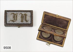 Kleine Schatulle, 2 x aufzuklappen, für 4 Münzen, geprägtes Leder mit Perlstickerei, opalisierende Glas und Metallperlen, Monogramm "D M", innen mit Samt ausgeschlagen, 2 St. 1/2 Mark dt. Kaiserreich, 1905/06 innenliegend, Messing Beschlag, Maße ca 65,0 x 36,o x 18,5 mm