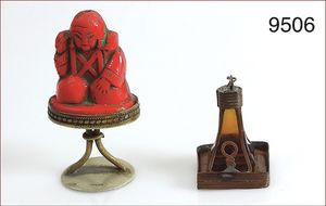 Lot: 1 Pettschaft, Kupfer, Glas mit Monogramm "M", Höhe ca 27,0mm, 1 Pfeifenstopfer Metall, Glasbuddha, H = 45,0 mm, beides um 1900