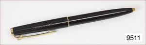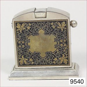 Benzinfeuerzeug, 30er Jahre, zum Zünden Kugel runterdrücken, Gehäuse schwarz und messingfarben ornamentiert (Eberhard u. Sohn Plakette ?), H = 81 mm