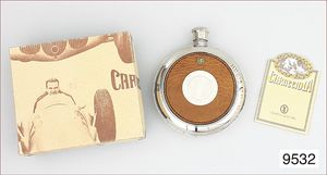 Flachmann, GOLDPFEIL, Edition Rudolf Carracciola, 50/60er Jahre, Stahl mit Leder apliziert, original Schachtel und Beschreibung
