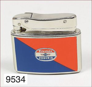 Benzinfeuerzeug 50.Jahre,FIRESTONE REIFEN PHÖNIX rot -blau hinterlegt, 1000 Zünder record, sehr guter Zustand, H = 46,