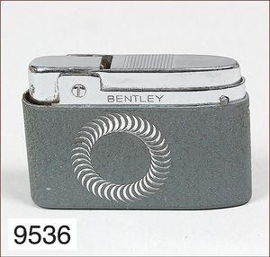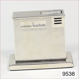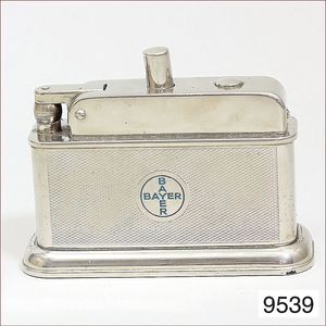 Benzinfeuerzeug, 30er Jahre, Feuerzeug mit seltener Technik ! 1 Knopf zum Zünden, 1 Knopf zum Schließen, BAYER Werbung, H = 80 mm