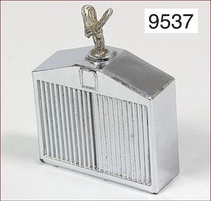 Benzinfeuerzeug, " Rolls-Royce Kühler", PERMANENT MATCH REG` D PATENTS, kein Reibrad ! Handhabung wie ein Zündholz, Kühlerfigur vergoldet, sehr ausgefallen, H = 46,