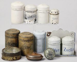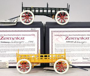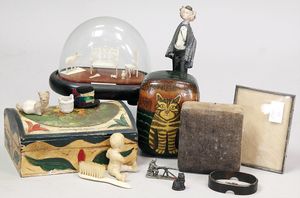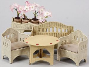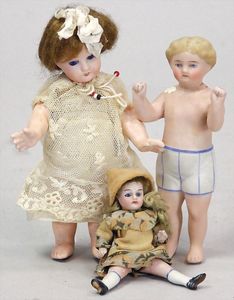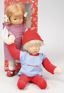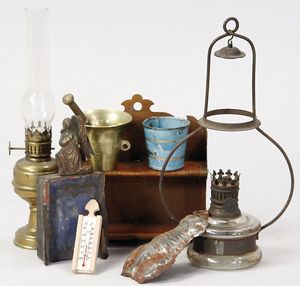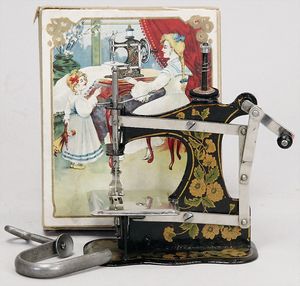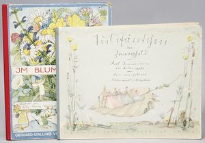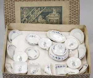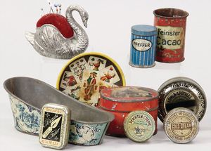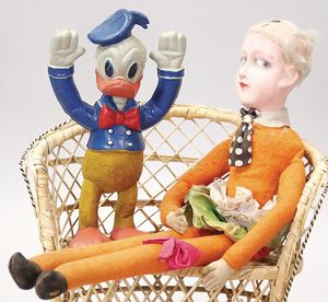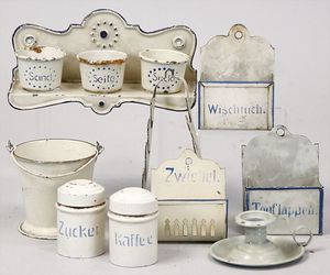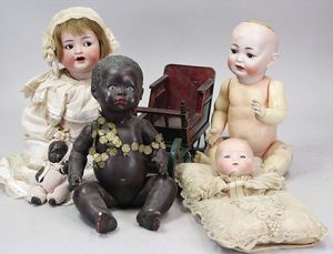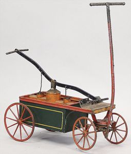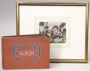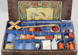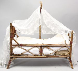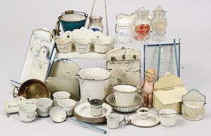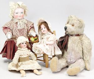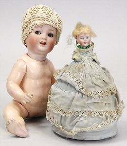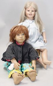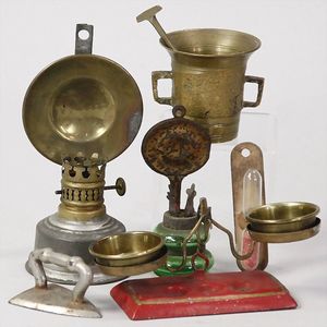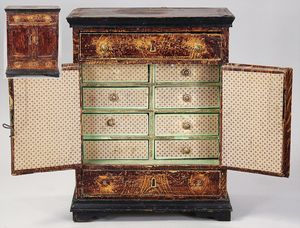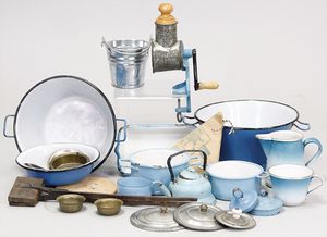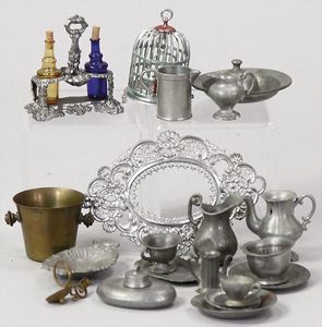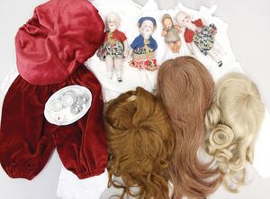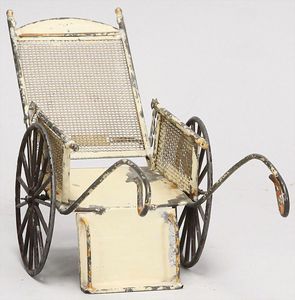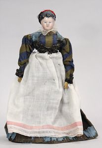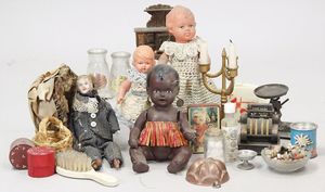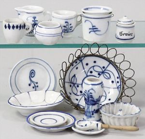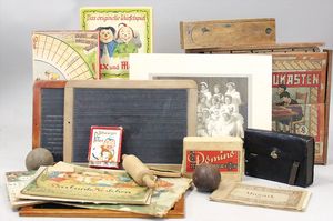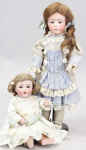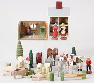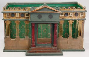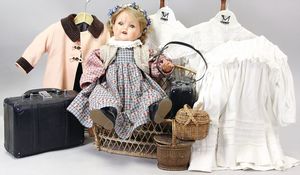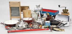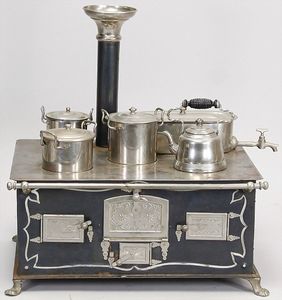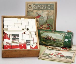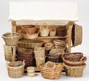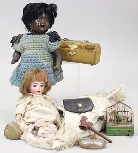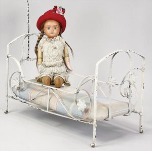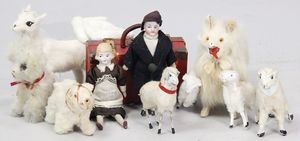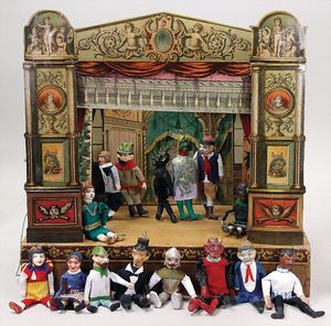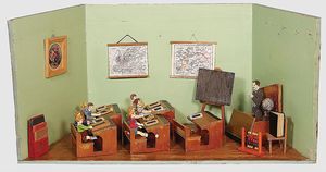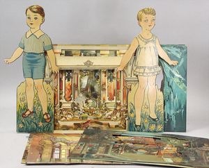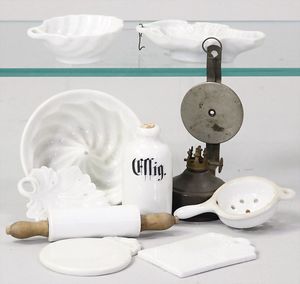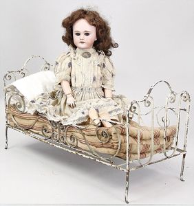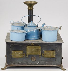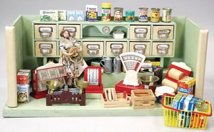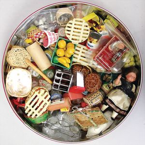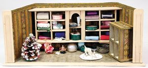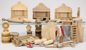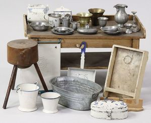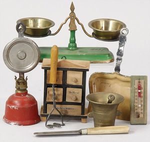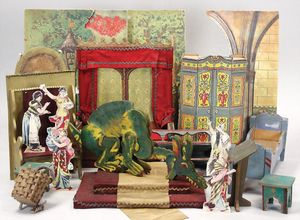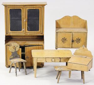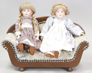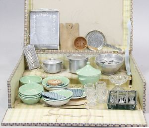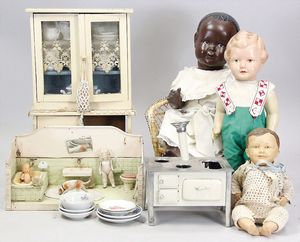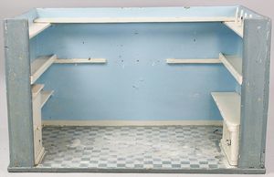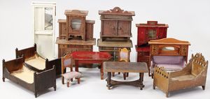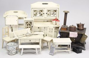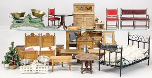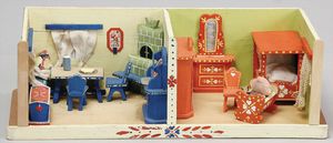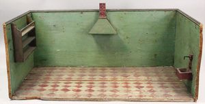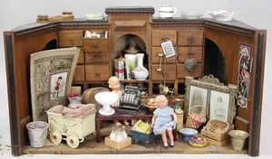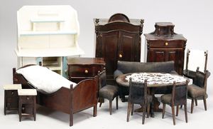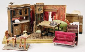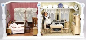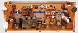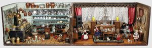 2-tlg. herrschaftl. Puppenstube, Küche, Wohnzimmer, 51 cm breit, 44 cm hoch, 44 cm tief, fest eingebaute Regale, Orig.-Bemalung an Wand und Boden, Herd aus der Zeit, Weißblech, Messingstange, eingebautes Wasserschiff, Kessel, Töpfe mit Messingdeckeln, einige frühe handgehämmerte Messingteile, Kaffeeröster, früher Weißblechteile, gedrehte Zinnteile, Holz und Keramik, Wohnzimmer mit herrschaftl. Möbeln, fein geschnitzt mit eingelegten Intarsien, Rock & Graner Blumentisch, Stubentisch, 4 Puppenstuben-Kinder, aufwendige Bodenbemalung, hochwertige alte Wandtapete, eines der schönsten Stücke aus dem Museum