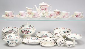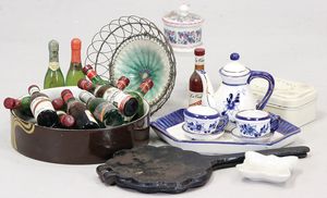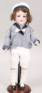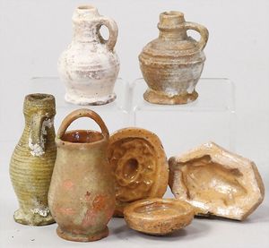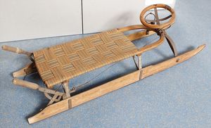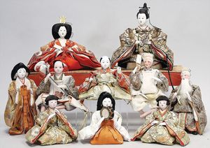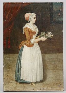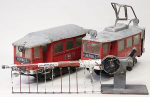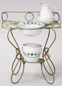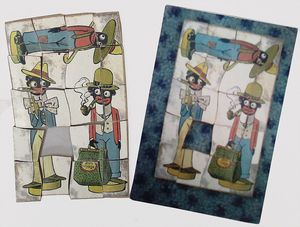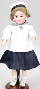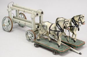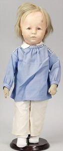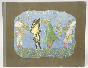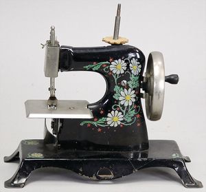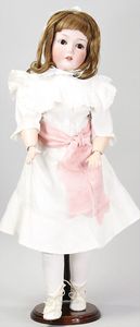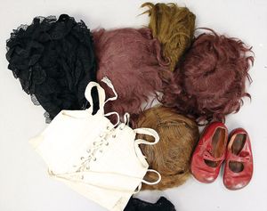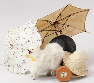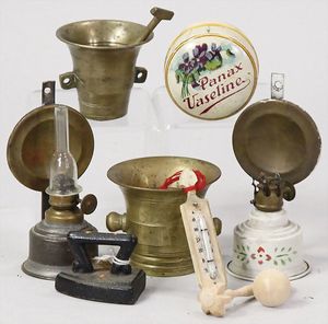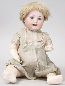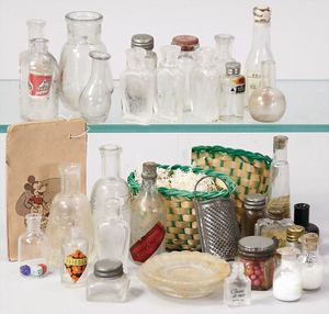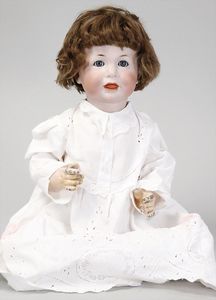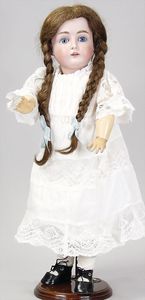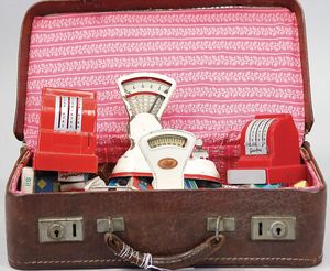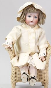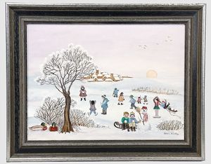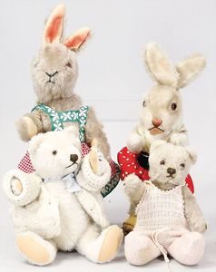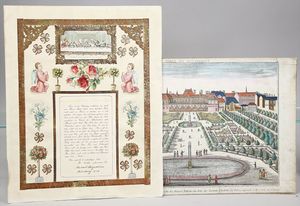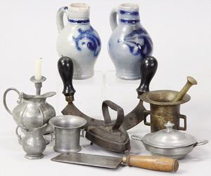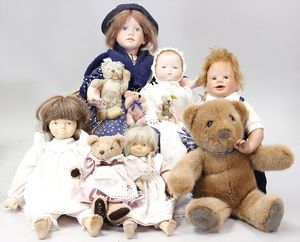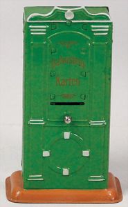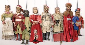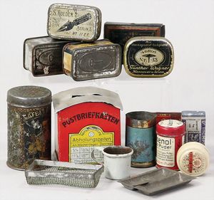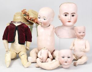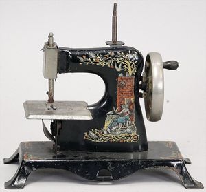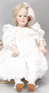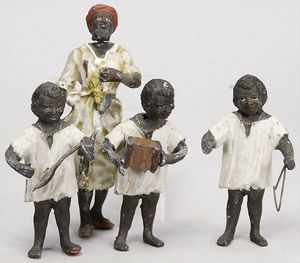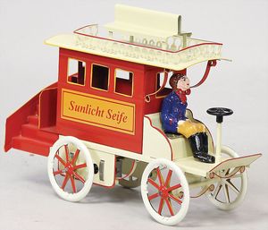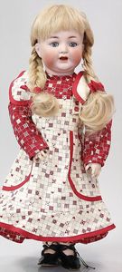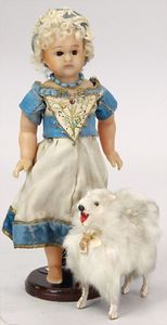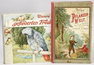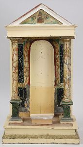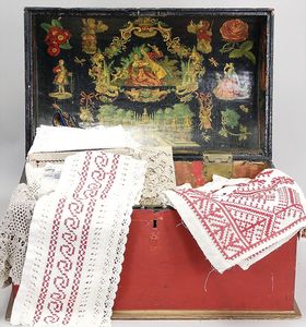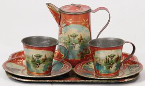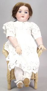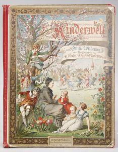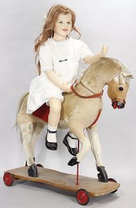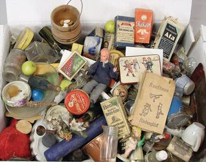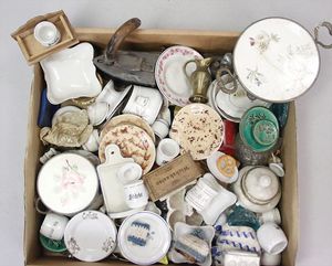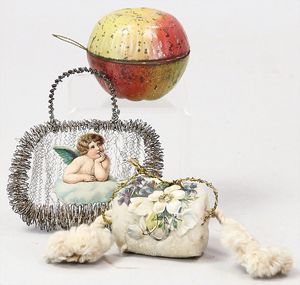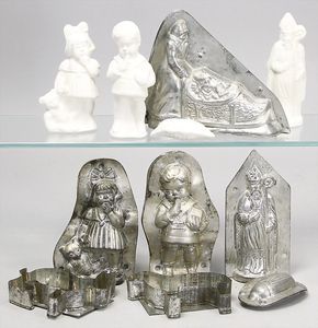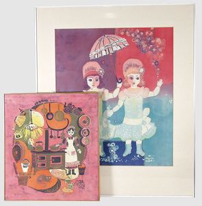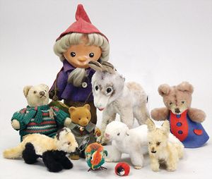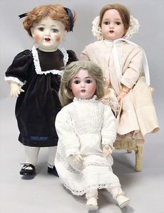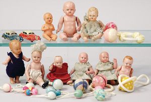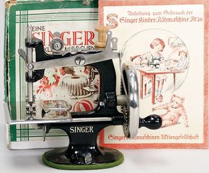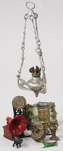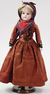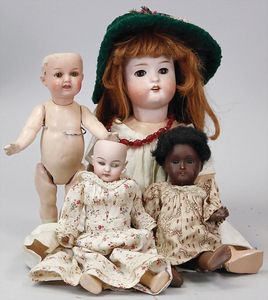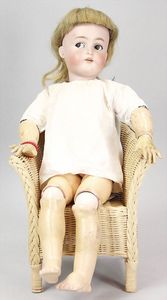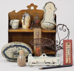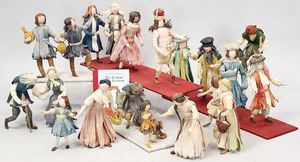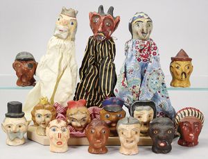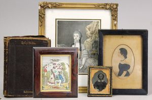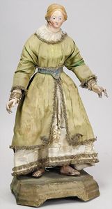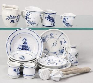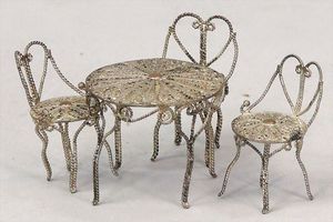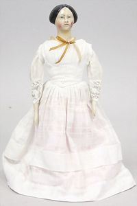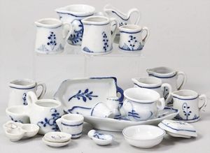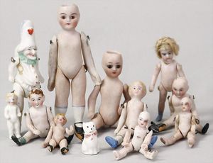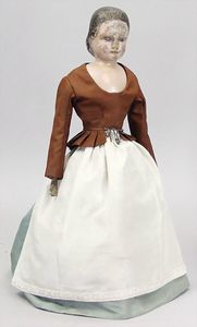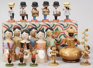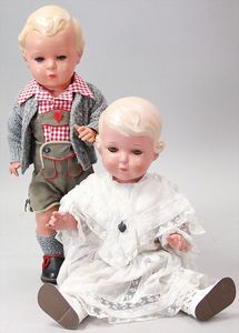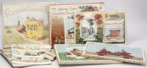 2-tlg. herrschaftl. Puppenstube, Küche, Wohnzimmer, 51 cm breit, 44 cm hoch, 44 cm tief, fest eingebaute Regale, Orig.-Bemalung an Wand und Boden, Herd aus der Zeit, Weißblech, Messingstange, eingebautes Wasserschiff, Kessel, Töpfe mit Messingdeckeln, einige frühe handgehämmerte Messingteile, Kaffeeröster, früher Weißblechteile, gedrehte Zinnteile, Holz und Keramik, Wohnzimmer mit herrschaftl. Möbeln, fein geschnitzt mit eingelegten Intarsien, Rock & Graner Blumentisch, Stubentisch, 4 Puppenstuben-Kinder, aufwendige Bodenbemalung, hochwertige alte Wandtapete, eines der schönsten Stücke aus dem Museum