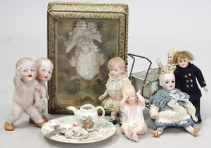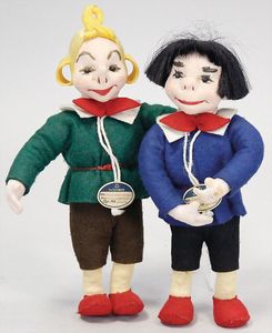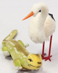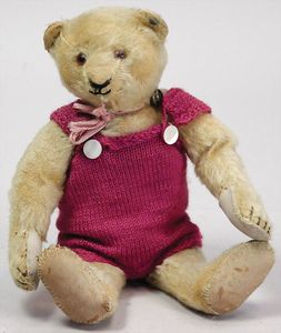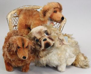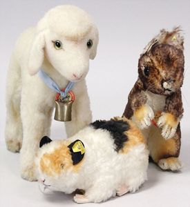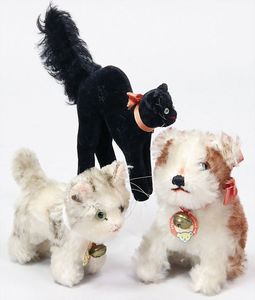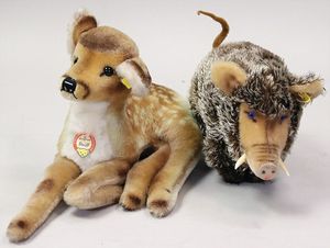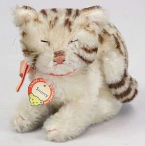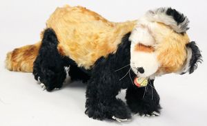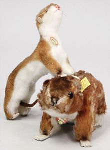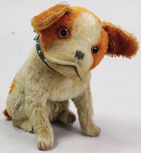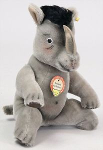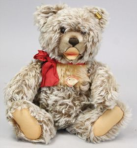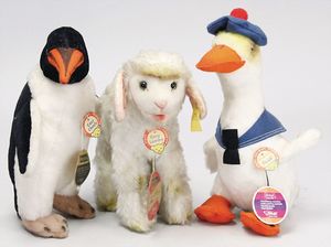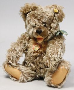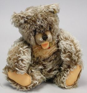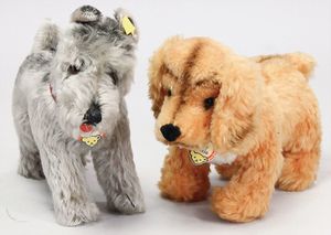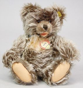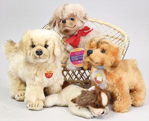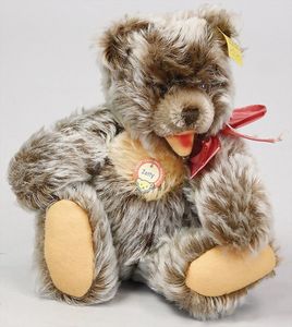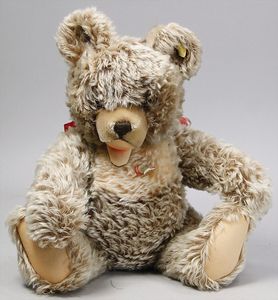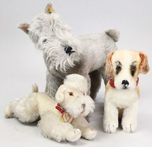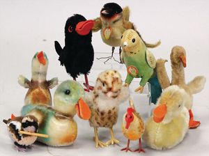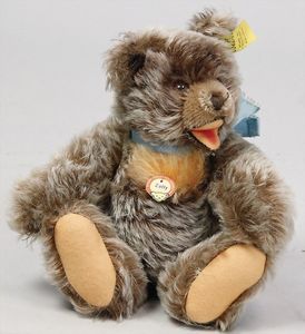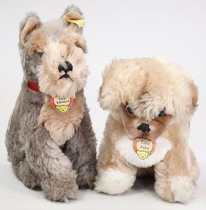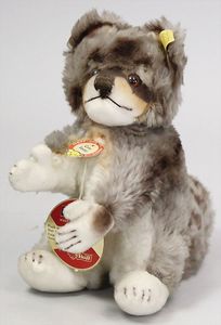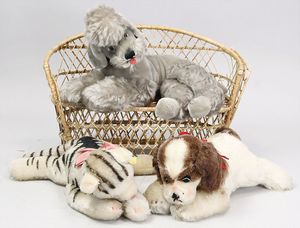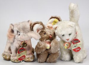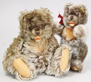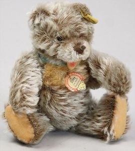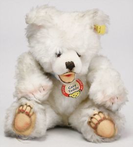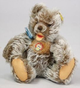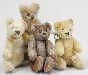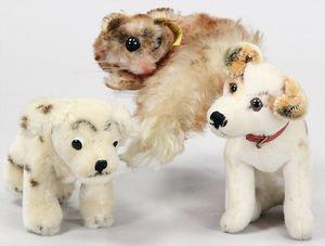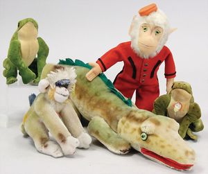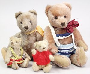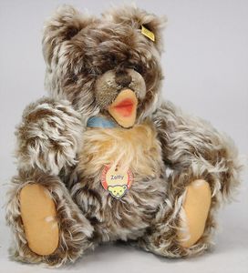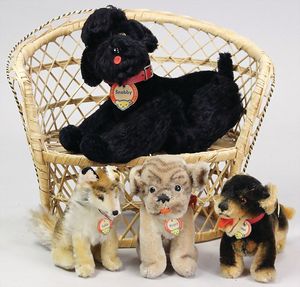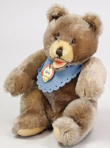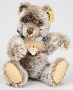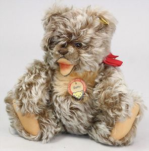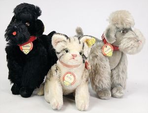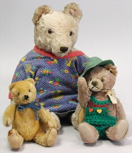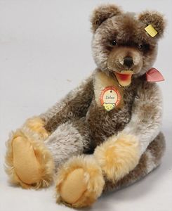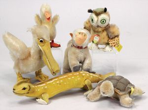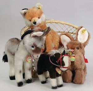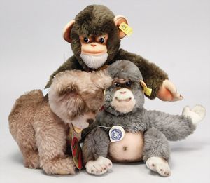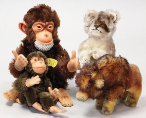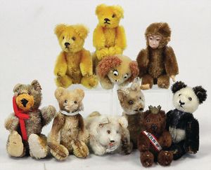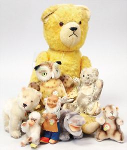 STEIFF Konv. 7 Teile, Wittie, mit Schild, ohne Knopf, 12 cm, 1 Eisbär, auf 4 Pfoten, mit Schild, ohne Knopf, Höhe 13 cm, Gorki, mit Schild, 1 Schuh fehlt, Mütze fehlt, Piss, mit Schild, ohne Knopf, 1 Affe, mit Knopf u. Fahne, 1 Mockie, mit Schild, ohne Knopf, 1 Zotty, stark abgeliebt, dazu 1 Jahrmarktsbär, gelb