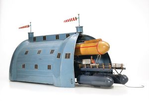 Heyde, Georg Hangar mit Zeppelin, absolut selten, ungemarkt, Deutschland, Dresden, um 1910, Maße: 210 x 170 x 480 mm, guter Allgemeinzustand, geringe Gebrauchsspuren, kleine Lackabplatzer und Kratzer, Windsäcke ergänzt, uns ist nur dieses eine Objekt bekannt; Zeitzeugnis aus den Anfängen der Luftfahrtindustrie. Spielzeug war immer Zeugnis seiner Zeit. Oft ist das kleinere Spiegelbild seltener als das Original. Eines der besonderen Stücke aus der Sammlung Depuoz. Die Luftschiffhalle in Kaditz, ausgelegt für zwei Luftfahrtschiffe, wurde 1931 innerhalb von nur sechs Monaten gebaut. Sie gleicht dem Spielzeug im Detail. Die Einweihung des Flugplatzes und Luftschiffhafens fand am 26. Oktober 1913 statt. Der Spielzeug-Hangar trägt das Besitzerzeichen der Gräfl. Bernadotte´schen Sammlung der Insel Mainau.