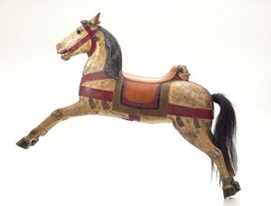 Karussellpferd auf Kufen, ungemarkt, wohl Deutschland, 1780 – 1800, Maße: 740 x 920 mm, Maße: 780 x 935 x 360 mm, Maße: 945 x 1290 x 445 mm, Holz, guter Allgemeinzust., Alters- und Gebrauchsspuren
