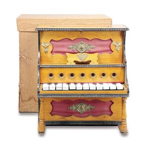 Kinderklavier mit Glockenspiel, ungemarkt, wohl Thüringen, 1880 – 1890, Maße: 400 x 330 x 270 mm, Maße: 370 x 365 x 283 mm, Holz, guter Allgemeinzust., funktionsfähig (aber scheppernd), Gebrauchs- und Altersspuren
