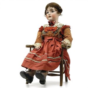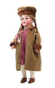 Kämmer & Reinhardt, Simon & Halbig Trachtenpuppe, Halsmarke "K [Stern mit] & R. / SIMON & HALBIG"; am Halsansatz "Germany / 100", Deutschland, Waltershausen / Gräfenhain (Thüringen), um1900, Größe: 1050 mm, Biskuitporzellan (Kurbelkopf), Glasaugen, Echthaar, guter Allgemeinzust., Gebrauchsspuren, Körper berieben und mit kleinen Ausbesserungen (u.a. an den Kniegelenken sowie an einem Finger der rechten Hand), Perücke ersetzt, alte Kleidung