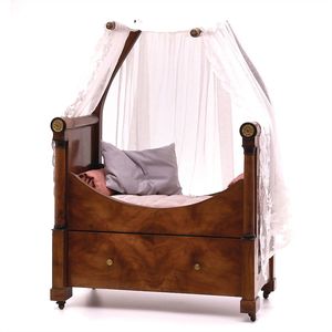 Puppenbett mit Baldachin, ungemarkt, wohl Deutschland, um 1850, Maße: 960 x 685 x 405 mm, Messingblech vergoldet, ordentlicher Allgemeinzust., Alters- und Gebrauchsspuren