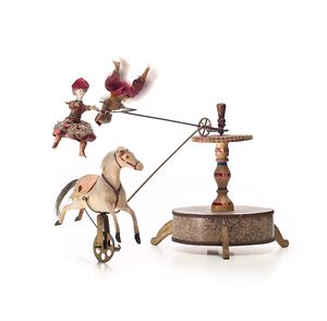 Ecuyère, Zirkus-Karussell, ungemarkt, Frankreich, um 1890, Maße: 315 x 430 x 220 mm, guter, funktionstüchtiger Allgemeinzust., leicht angestaubt, 1 Bein des Pferdes angeklebt, Schweif ersetzt, Alters- und Gebrauchsspuren