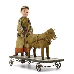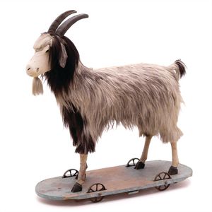 Räderziege mit Stimme, Angabe in Bleistift "ADW / f 35504", wohl Deutschland, 1890 – 1900, Maße: 850 x 850 x 330 mm, ordentlicher Allgemeinzust., Stimme funktionstüchtig, erhebliche Alters- und Gebrauchsspuren, Grundplatte mit Randabbrüchen, Abplatzern und starken Farbverlusten, Hörner etwas lose