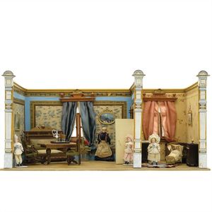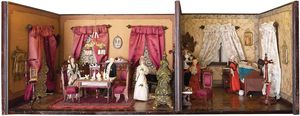 2 tlg. Puppenstube, Wohnzimmer, Schlafzimmer, Gründerzeit, 1880 – 1890, Maße: 385 x 1112 x 385 mm, reichhaltig Zubehör, mit Puppen, guter Allgemeinzust., Alters- und Gebrauchsspuren