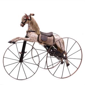 Velociped, Reitpferd-Dreirad, ungemarkt, Frankreich, um 1890, Maße: 80 x 970 x 540 mm, aufgearbeiteter Allgemeinzust., funktionstüchtig (Vorderrad läuft / kippt nach rechts), Alters- und Gebrauchsspuren, Sattel und Satteldecke ergänzt