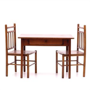 Kindersitzgruppe ,Tisch und 2 Stühle, ungemarkt, Deutschland, 1900 – 1910,Maße: 525 x 700 x 500 mm, Maße: 680 x 360 x 320 mm, Holz, Metall, guter Allgemeinzust., Gebrauchsspuren