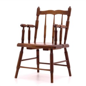 Kinderstuhl mit Armlehnen, Marke auf der Unterseite der Sitzfläche geprägtes Markenzeichen mit 3 überlappenden Kreisen mit jeweils 1 Initiale (nicht zu entziffern), Deutschland, 1900 – 1910,Maße: 600 x 350 x 345 mm, Holz, guter Allgemeinzust., Gebrauchs- und Altersspuren, Sitzfläche mit durchgehendem, geklebtem Sprung