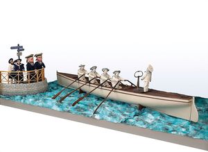 Rameurs de course (Rennruderboot), Automat, Prototyp, Marke am Schlüssel die eingeprägte Nummer "21", wohl Frankreich, Paris, ab 1879, Maße: 310 x 1350 x 680 mm, funktionstüchtiger Allgemeinzust., Puppen mit nachgearbeiteten Kostümen, 1 Hand (beim zweiten Ruderer) mit abgeplatztem Finger, 2 Ruderblätter mit Randchips, 1 Ruder gebrochen (wieder geklebt), dazu mit Patentschrift (Kopie) – Zusammenfassung: Durch die exakte und integrale Reproduktion des Wettruderns, in Verbindung mit einem Rennboot mit „porte-nage“ ou Yoles-gigs oder Gigs tangentiell, ohne Beeinträchtigung eines natürlichen Aussehens, haben wir ein neues Wasserspielzeug geschaffen, vollumfänglich anders als alles was es bisher gab, sowohl in seiner Funktionalität als im Aussehen, sodass es ein neues industrielles Produkt darstellt, für das wir in seiner Gesamtheit und in seinen Details beanspruchen, denn wir werden den Automat „rameurs de course“ weiterbauen, ganz andere Kombinationen gleichbedeutend wie die, die jetzt in großer Zahl der Funktionalität wie sie jetzt von mir geschaffen werden. Paris, 21. Juli 1879 B.Scal