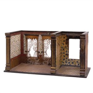 Gottschalk, Moritz 2 tlg. Puppenstube, Wohnzimmer (Salon), Schlafzimmer, Katalogabbildung von 1895, Kühnlenz, Gebr., AG, Babypuppe, Marke Babypuppe am Rücken "13 - 6" (schwer leserlich, evtl. Gebr. Kühnlenz), Deutschland, Marienberg, 1880 – 1910, Maße: 360 x 730 x 370 mm, guter Allgemeinzust., Gebrauchsspuren, Gehäuse mit kleineren Lackschäden an den Frontsäulen, von außen farblich überarbeitet