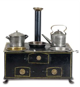 Herd, ungemarkt, wohl Deutschland, Biberach, 1870 – 1880, Maße: 360 x 360 x 270 mm, Schwarzblech, Weißblech, guter Allgemeinzust., Alters- und Gebrauchsspuren, Schornstein mit altem Material ersetzt (unterer Ring unpassend), Füße ergänzt, Topfsatz und das weitere Zubehör wohl original