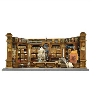 Kolonialwarenladen, Will, Johann Martin, Kupferstich, Puppe ungemarkt; viele Verpackungen mit Markennamen und Herstellerangaben (u.a. 1 Glasbehälter mit Datierung 1890 und 1 Stoffsack mit den Initialen "SR, Deutschland (überwiegend),1890 – 1900, Maße: 390 x 860 x 345 mm, ordentlicher Allgemeinzust., deutliche Alters- und Gebrauchsspuren