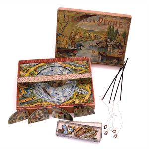 Saussine, Leon Jeu de la Pêche a Musique - Por el Juego, Imantado de la Pesca con Musica – Musical Magnetic Fishing Game (Musikalisches Angelspiel), Edit. Paris"; auf der Unterseite des Schachtelbodens runde, rote Papiermarke mit den verschlungenen Initialen "SE" sowie Reste eines alten Verkaufsetiketts, Frankreich, Paris, um 1900, Maße: 170 x 450 x 325 mm, guter, funktionstüchtiger Allgemeinzust., Alters- und Gebrauchsspuren, einzelne Fische und Objekte ohne Ring, Deckelbild berieben