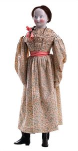 Puppe (China Head), Deutschland, Thüringen, um 1850, Maße: 750 mm, glasiertes Porzellan (Brustkopf), Echthaar, guter Allgemeinzust., Nasenspitze und Stirn leicht berieben, Oberkörper mit Stoff überzogen, Körper berieben, alte Kleidung, z.T. zerschlissenen, Lederschuhe