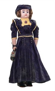 Buschow & Beck Puppe (Blechkopf), Marke "7" an der hinteren Schulterplatte, Deutschland, Nossen (Sachsen), um 1900, Maße: 63 cm, Metall (Brustkopf), Glasaugen (liegen lose bei), Echthaar, Leder, Draht, Biskuitporzellan-Unterarme, Wachstuch, Leder, guter Allgemeinzust., Gebrauchsspuren, Perückenpull, Körper mit wenigen kleinen Löchern, Kleidung ergänzt