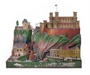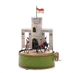 Burganlage mit Reitern, ungemarkt, Deutschland, Zschopau, um 1910, Maße: 215 x 160 x 135 mm, Blech, Eisenguss, Zinn, guter Allgemeinzustand, funktionstüchtig (bis auf die große Fahne), Gebrauchs- und Altersspuren wie kleine Farbverluste (z.B. an den Zinnen und an den Reitern), Drehplatte leicht verzogen, Reiter zum Teil etwas verbogen, 2 Federbüsche abgebrochen, Fahne vermutlich ersetzt (mit ergänzter Stange)