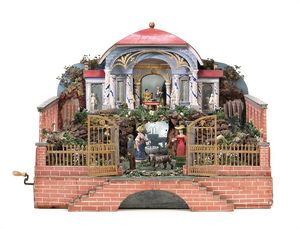 Lustgarten, ungemarkt, Thüringen, um 1820, Maße: 465 x 590 x 460 mm, funktionstüchtiger Orig.-Zustand, museales kunstvoll gearbeitetes Objekt, für den anspruchsvollen Sammler, wohl Bestelmeier; Der Weg zurück nach Ladenburg: 2005 wurde der Lustgarten als Weihnachtsgeschenk für Fr. Depuoz von Hr. Depuoz ersteigert. Er kam direkt aus einem namenhaften Spielzeugmuseum. Wir hoffen, dass der Lustgarten wieder einen würdigen Platz in einer hochwertigen Sammlung findet. Ein besonderes Stück aus der Sammlung Depuoz.