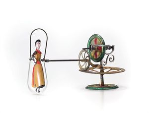 Mädchen beim Seilspringen, geprägte Marke "J.L.B.T. SGDG", Frankreich, um 1900, Maße: 110 x 200 x 90 mm, guter Allgemeinzust., vollständig und funktionstüchtig, 3 Bruchstellen am horizontalen Rad, kl. Lackabplatzer an der Figur, Lötstelle zwischen Verbindungsstange und Figur erneuert