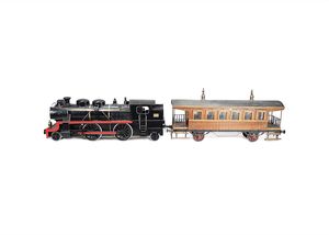 Dampflokomotive mit Personenwagen, Marke seitlich am Tender jeweils Messingplakette mit der eingravierten, Nummer "258", Herst. Ort wohl Deutschland, um 1930, Maße: 300 x 810 x 205 mm, Maße: 360 x 820 x 240 mm, guter Allgemeinzust., leichte Alters- und Gebrauchsspuren