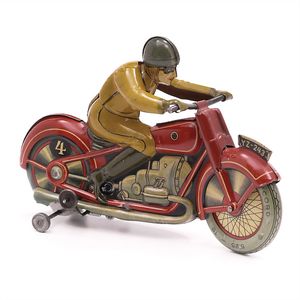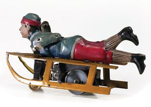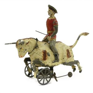 Günthermann, Siegfried Stierreiter, ungemarkt, Deutschland, Nürnberg, um 1905, Maße: 150 x 190 x 70 mm, guter Allgemeinzustand, Farbabplatzer, eine Speiche teilweise abgebrochen; funktionstüchtig