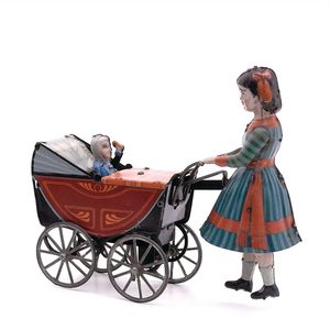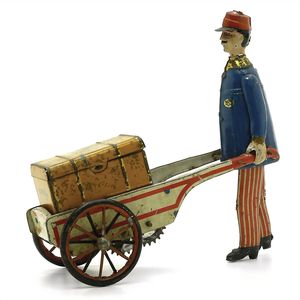 Stock, Walter Dienstmann, gemarkt "W St / 185"; vorne an der Karre die Bezeichnung in roter Schrift: "Made in Germany", darunter Stock-Marke mit Firmensignet (gekreuzte Spazierstöcke als Gesicht ausgebildet), darunter "D.R.G.M.", Deutschland, Solingen, um 1935, Maße: 160 x 175 x 85 mm, guter Allgemeinzustand, bespielt; funktionstüchtig