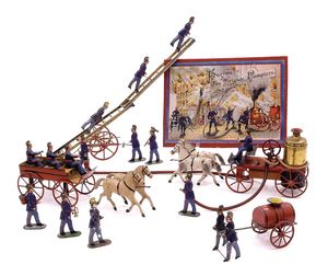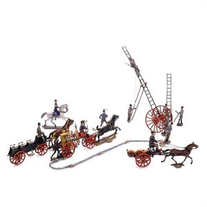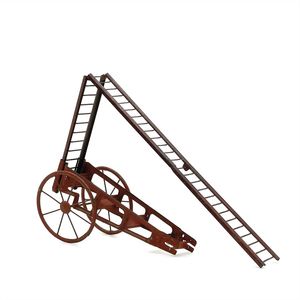 Feuerwehrleiter mit Fahrgestell, ungemarkt, Frankreich, um 1900, Maße: 240 x 365 x 110 mm, Blech, guter Allgemeinzustand, Gebrauchs- und Altersspuren wie leichte Lackverluste und Korrosionen (v.a. an der Leiter), Leiter und Fahrgestell nicht original zusammengehörig (Leiter hat etwas "Spiel" und weicht farblich ab), Fahrgestell ursprünglich Teil eines Gespanns