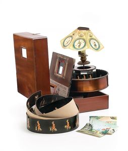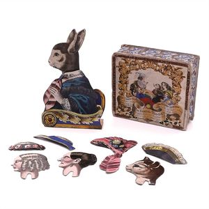Faber, Georg Wolfgang Das komische Mädchen - Unterhaltung mit einer Pendelfigur in vielerlei Gestalten, Marke auf dem Deckelbild die Herstellerinitialen "G.W.F. & W.", Deutschland, Nürnberg, um 1850, Maße: 50 x 150 x 130 mm, Maße: 175 x 120 x 35 mm, ordentlicher Allgemeinzustand, Gebrauchs- und Altersspuren, es fehlen 2 Köpfe (Farbige und Huhn) sowie 3 Kopfbedeckungen (2 Hauben und 1 Zipfelmütze), dafür 1 zusätzliche Kopfbedeckung (Dreispitz) aus dem Parallelset "Der komische Knabe"