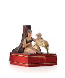 Schäferin mit Lamm, ungemarkt, Deutschland, Thüringen, um 1830, Maße: 145 x 110 x 165 mm, guter bis sehr guter Allgemeinzustand, geringe Gebrauchsspuren wie kl. Bruchstellen; funktionstüchtig, 1 Arm bewegt sich