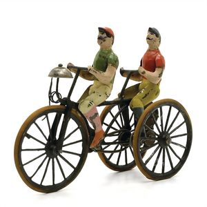 Tandem, ungemarkt, Frankreich, um 1910, Maße: 115 x 145 x 55 mm, guter Allgemeinzustand, Farbverluste, echte Gummireifen, funktionstüchtig