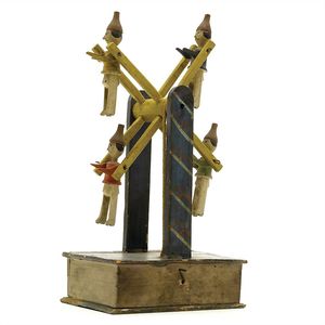 Erzgebirge Russenschaukel, ungemarkt, Deutschland, Erzgebirge, 1860-1880, Maße: 270 x 160 x 107 mm, Holz, Draht, Schnur, guter Allgemeinzustand, Gebrauchsspuren, funktionstüchtig, Sockel restauriert (Boden in Teilen ersetzt, obere Platte mit Farbretuschen)