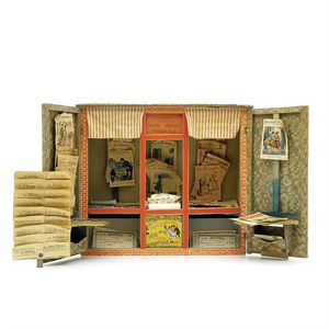 Nicolas & Keller (Atlas) Bureau de poste, Zeitungskiosk, Post, Zeitungen, Zeitschriften, Marke an beiden Türen Klebeetikett jeweils mit dem Schriftzug "Les Jeux & Jouets / De L'Atlas / La Meilleure Marque N. K. Paris." (= Nicolas Keller); innen Ladenschild mit den Initialen "N-K" Frankreich, Paris, um 1910, Maße: 405 x 475 x 160 mm, Maße: 405 x 750 x 160 mm, mit Zubehör, guter Allgemeinzust., Alters- und Gebrauchsspuren