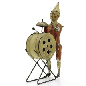 Günthermann, Siegfried Clown mit Pauke, ungemarkt, Deutschland, Nürnberg, um 1910, Maße: 190 x 65 x 115 mm, guter Allgemeinzustand, Farbabplatzer; funktionstüchtig; Schlüssel fehlt
