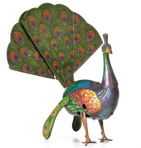 Eberl, Hans Pao-Pao (Pfau), Rundmarke mit Clown und Monogramm HEN (im äußeren Kreis die Bezeichnung "Made in Germany"), Deutschland, Nürnberg, um 1920, Maße: 200 x 250 x 105 mm, Blech, guter Allgemeinzustand, leichte Gebrauchsspuren mit Farbverlusten; funktionstüchtig; Blasebalg fehlt