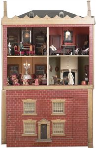 Puppenhaus, Salon, Küche, Bibliothek, Schlafzimmer, Rock & Graner, Blechmöbel, England (Haus), Deutschland, Biberach u.a. (Inventar), 1860 – 1870, Maße: 935 x 950 x 420 mm, guter Erhaltungszust., Alters- und Gebrauchsspuren, Tapeten teils orig., teils ergänzt, möbliert, mit reichh. Zubehör