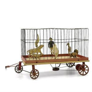 Zirkuswagen, Halbautomat, ungemarkt, Frankreich, 1925 – 1930, Maße: 290 x 520 x 260 mm, guter Allgemeinzustand, funktionstüchtig, Gebrauchsspuren, leichte Lackschäden, mit 6 Celluloidtieren und Dompteur