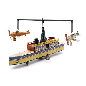 Kellermann & Co., G.G. Passagierdampfer mit Flugzeugen, Penny Toy, Marke am Bug Firmenzeichen und die Seriennummer 226, am Heck die Angabe "Made in Germany"; an den Flugzeugen Firmenzeichen, Seriennummer 269 und die Angabe "Made in Germany" an den Heckflügeln, Deutschland, Nürnberg, um 1930, Maße: 115 x 225 x 230 mm, Blech, Metall, guter, funktionstüchtiger Allgemeinzustand, leichte Gebrauchs- und Altersspuren wie Verschmutzungen, Achse (mit Rad) und hinterer Schornstein fehlen, vermutlich gab es noch einen weiteren Aufbau auf dem Außendeck