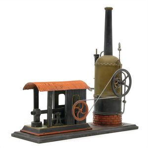 Plank, Ernst seltene Uhrwerk-Dampfmaschine mit Hammerschmiede, Antriebsmodell, Marke auf dem Kessel ovale, geprägte Messingplakette mit dem Firmenemblem von Plank ("E.P."), Deutschland, Nürnberg, um 1895, Maße: 300 x 300 x 130 mm, Blech, Eisenguss, Zinnguss, Messing, Holz, guter, funktionstüchtiger Allgemeinzustand, Gebrauchs- und AltersspurenSchlüssel und Treibriemen ergänzt