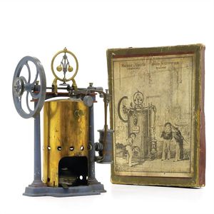 Rossignol, Charles Machine à Vapeur Verticale (Dampfmaschine), Marke auf der Plattform die plastischen Initialen "C.R." und die Angabe "Constructeur", auf der Unterseite zusätzlich "Paris / France / 555"; auf der Schachtel die gleichen Informationen, ergänzt um die "No. 555", "Breveté S.G.D.G." und "France", Frankreich, Paris, um 1885, Maße: 190 x 150 x 90 mm, vollständig und funktionsfähig