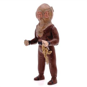 Taucher, Marke ungemarkt, wohl Frankreich, 1890 – 1900, Maße: 188 x 76 x 74 mm, Blech, guter Allgemeinzustand, Alters- und Gebrauchsspuren, ohne Pumpmechanismus und Schlauch, Seil vermutlich ersetzt