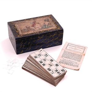 Lotterie - Neues Gesellschafts-Lottospiel – Lotto di Genua, "Nbg." für Nürnberg, Deutschland, Nürnberg, um 1820, Maße: 85 x 210 x 128 mm, guter Allgemeinzustand, Gebrauchsspuren, Karte G1 ersetzt